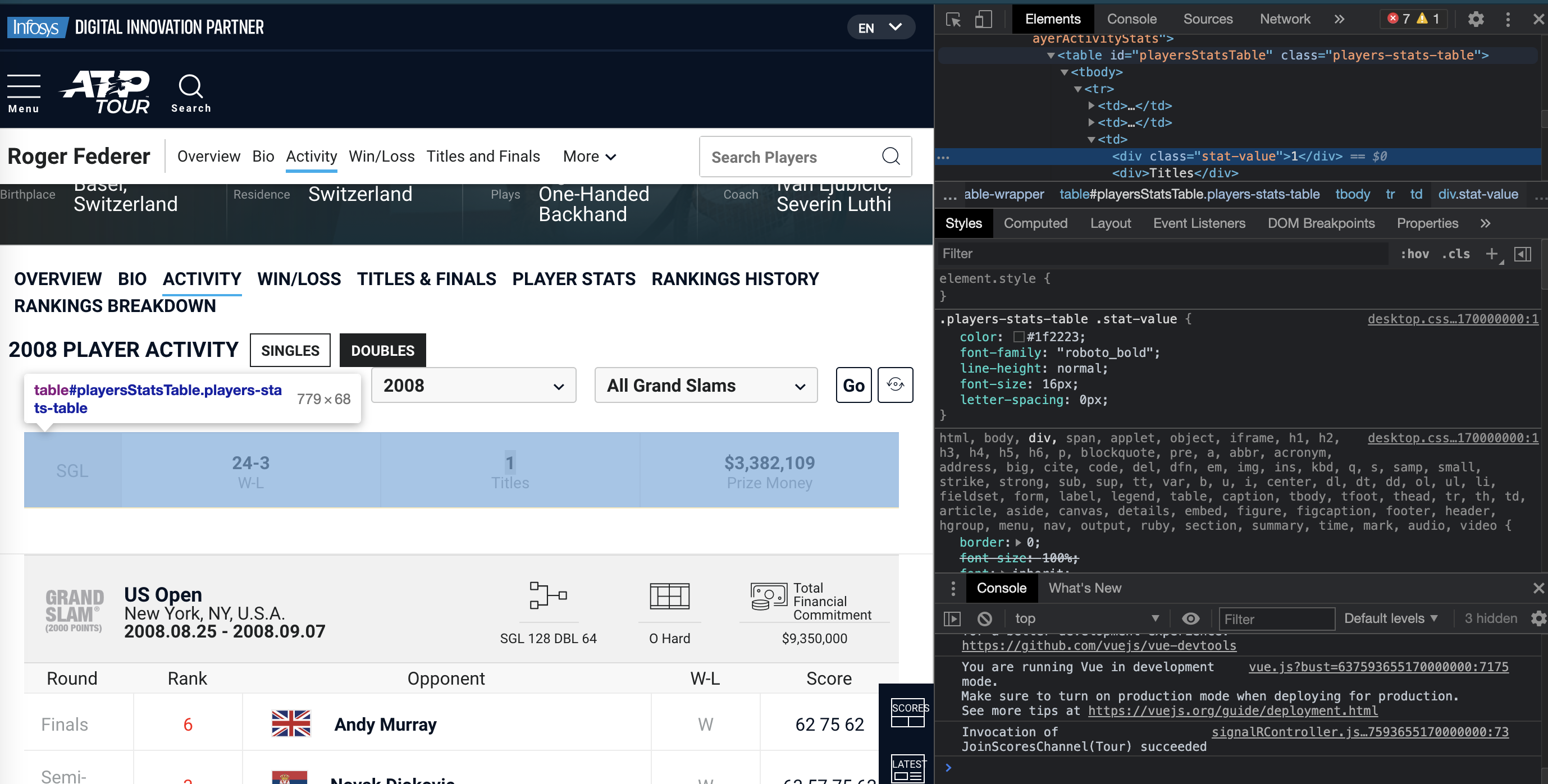 Analyzing golden era of tennis using data analytics was a best use case to explore web scraping. It made sense to start with a smaller dataset and gather total grand slam titles won by these players every year. To further build a race chart showcasing their career progression and succession to the top as The Big 3. After considering several alternatives, best course of action was to use Python as the preferred language to tell this story.